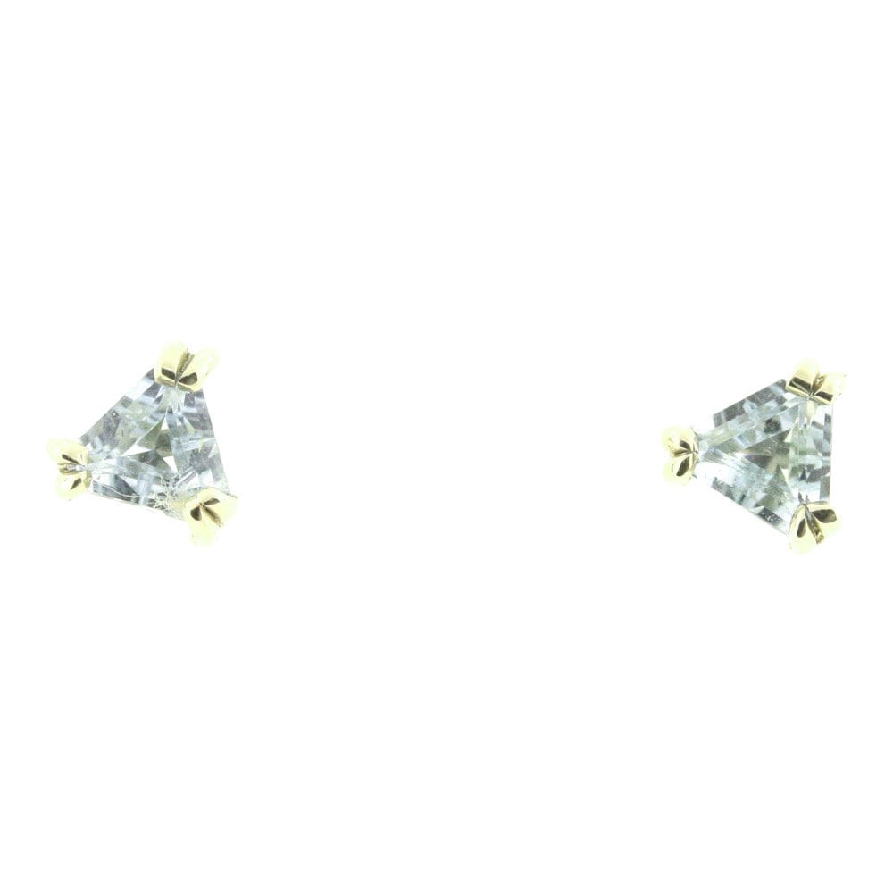 These 5mm, 0.30TCW, trilliant-cut Aquamarine are set in 14kt white-gold or 14kt yellow-gold basket post settings. The Aquamarine stones have nice blue color. They are perfect for small or young earlobes or as an accent color in a second ear piercing. White-gold earnuts are included.