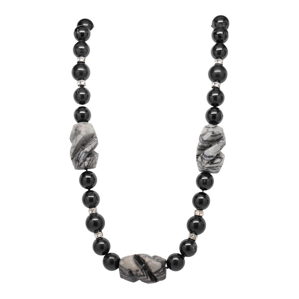 This 24-inch long hand-knotted Black Tourmaline accented with Swarovski Crystal Roundels and Zebra Jasper necklace consists of 12 & 14mm round Tourmaline beads with 3-20x31mm Zebra Jasper beads that are triangular in cross-section and fretted; it is finished off with a Sterling Silver clad magnetic barrel clasp.