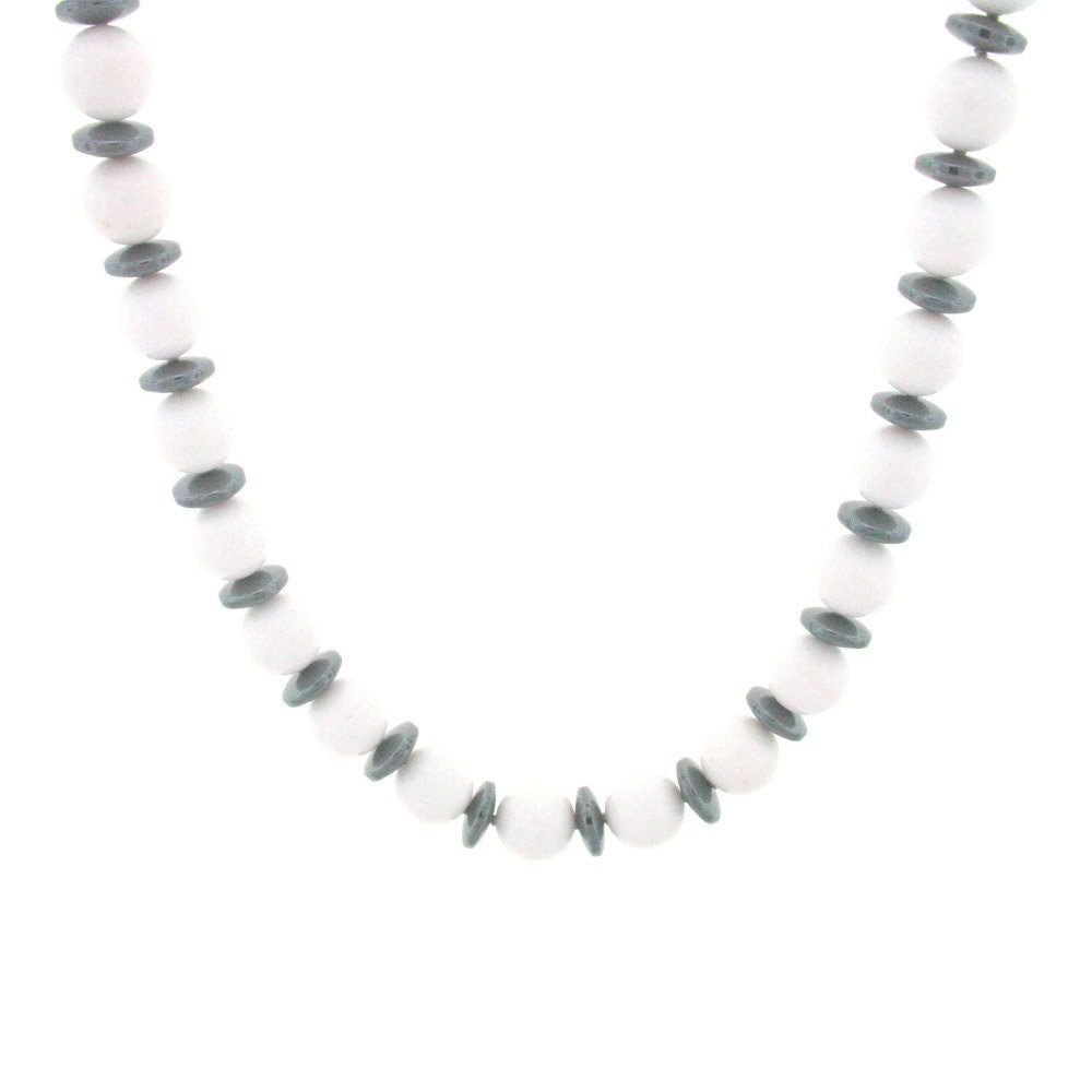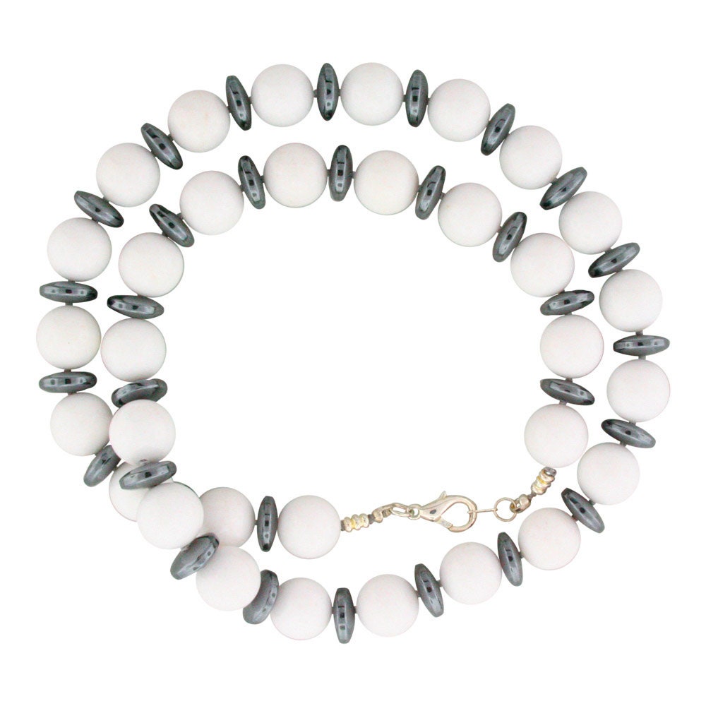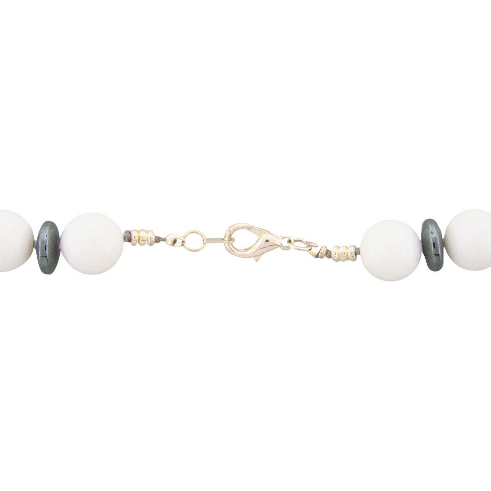 This 23-inch long hand-knotted necklace is made of 12mm round White New Jade Beads, 10mm Hematite saucer & 4mm corrugated cylinder sterling silver beads, It is finished with a sterling silver lobster-claw clasp.